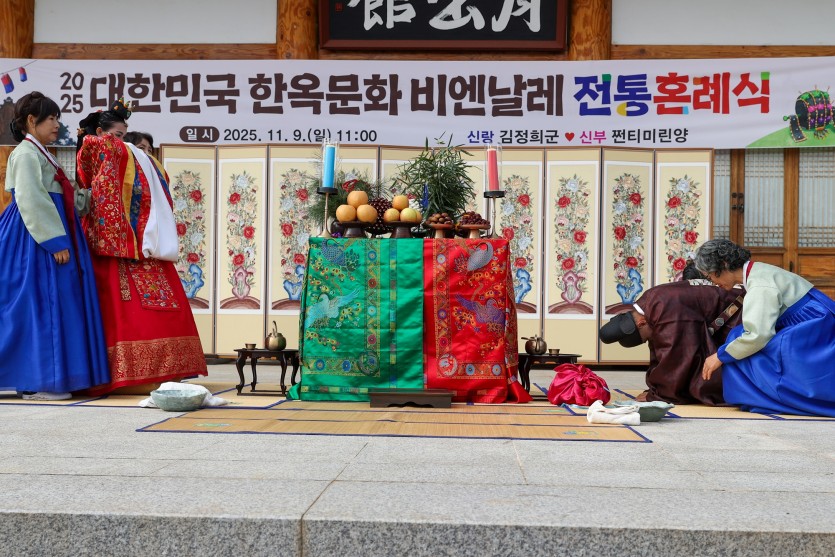 9일 영암목재문화체험장에서 '2025 대한민국 한옥문화 비엔날레' 행사의 하나로 전통혼례식이 진행됐다.